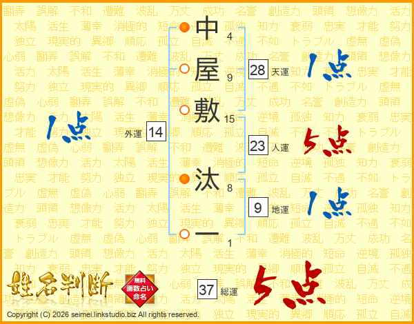 中(4画)屋(9画)敷(15画) 汰(8画)一(1画)