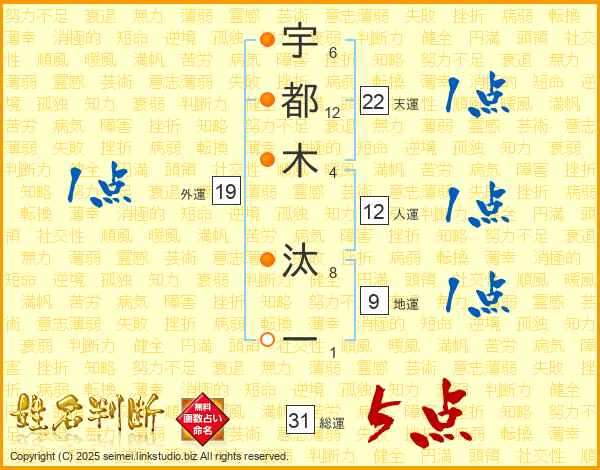 宇(6画)都(12画)木(4画) 汰(8画)一(1画)
