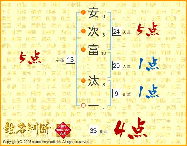 安(6画)次(6画)富(12画) 汰(8画)一(1画)