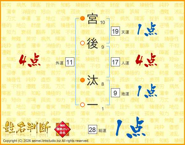 生活面を象徴する運勢です。外部から受ける影響力を表し、結婚運、家庭運や職場、環境への順応性を表します。総運から人運を引いた画数。姓や名が1文字の場合を除く。