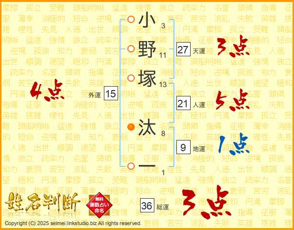 小(3画)野(11画)塚(13画) 汰(8画)一(1画)