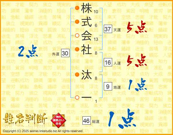 株(10画)式(6画)会(13画)社(8画) 汰(8画)一(1画)