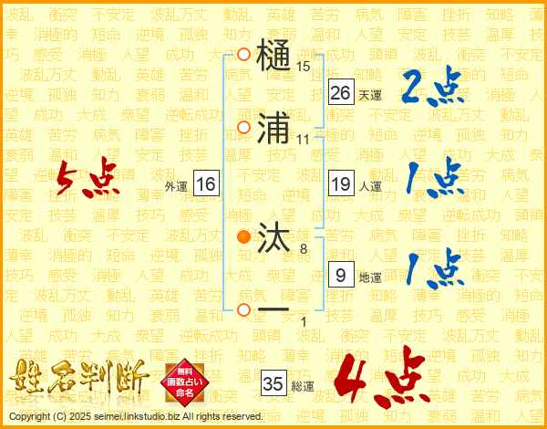 樋(15画)浦(11画) 汰(8画)一(1画)
