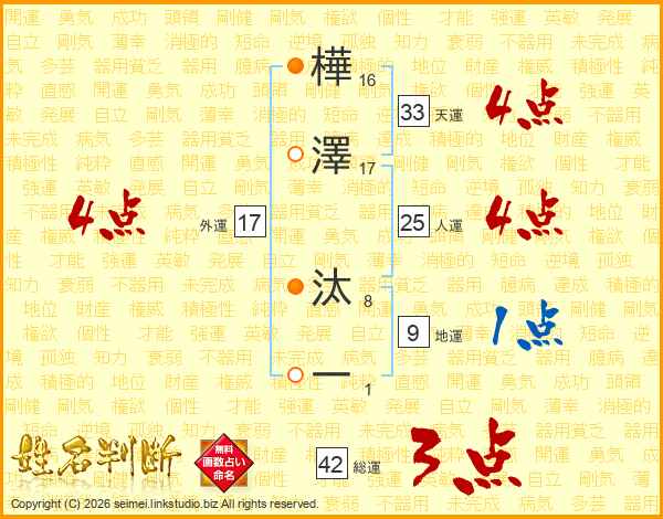 樺(16画)澤(17画) 汰(8画)一(1画)