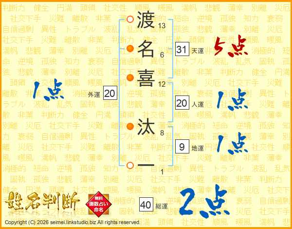 渡(13画)名(6画)喜(12画) 汰(8画)一(1画)