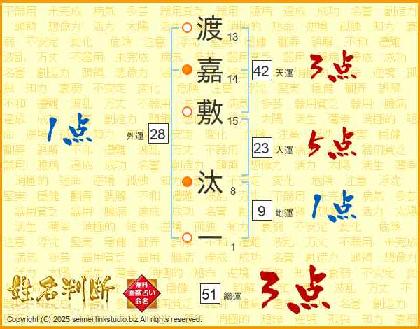 渡(13画)嘉(14画)敷(15画) 汰(8画)一(1画)