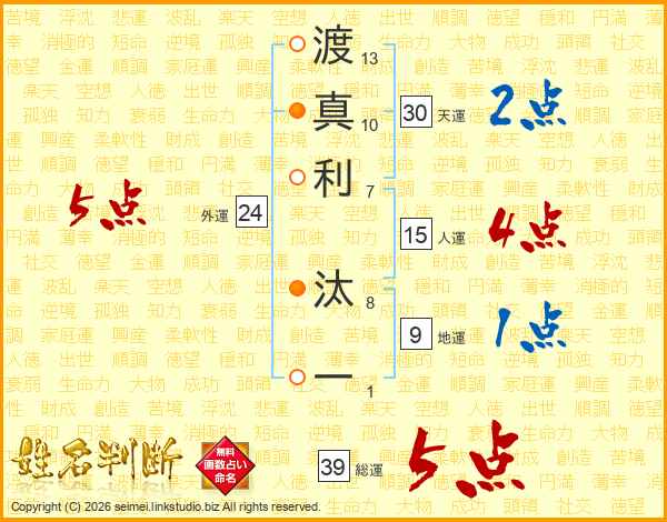 渡(13画)真(10画)利(7画) 汰(8画)一(1画)