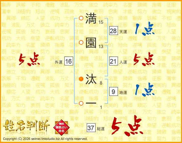 生活面を象徴する運勢です。外部から受ける影響力を表し、結婚運、家庭運や職場、環境への順応性を表します。総運から人運を引いた画数。姓や名が1文字の場合を除く。