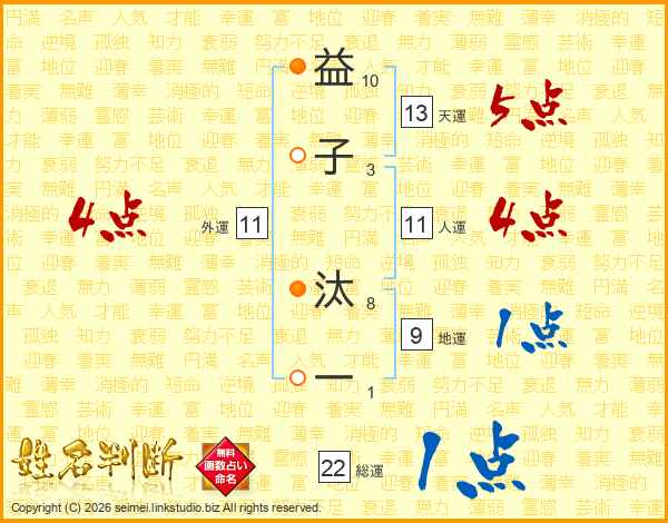 生活面を象徴する運勢です。外部から受ける影響力を表し、結婚運、家庭運や職場、環境への順応性を表します。総運から人運を引いた画数。姓や名が1文字の場合を除く。