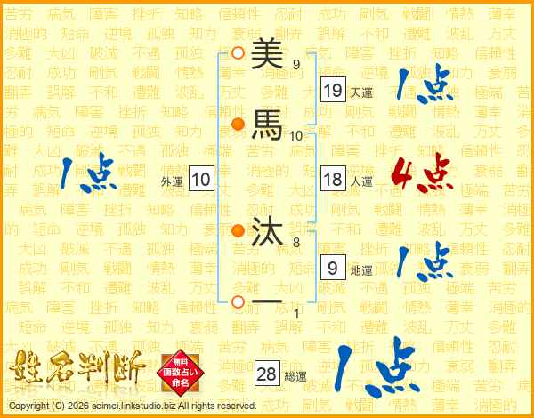 生活面を象徴する運勢です。外部から受ける影響力を表し、結婚運、家庭運や職場、環境への順応性を表します。総運から人運を引いた画数。姓や名が1文字の場合を除く。