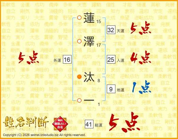蓮澤汰一さんの総運は41画の5点!