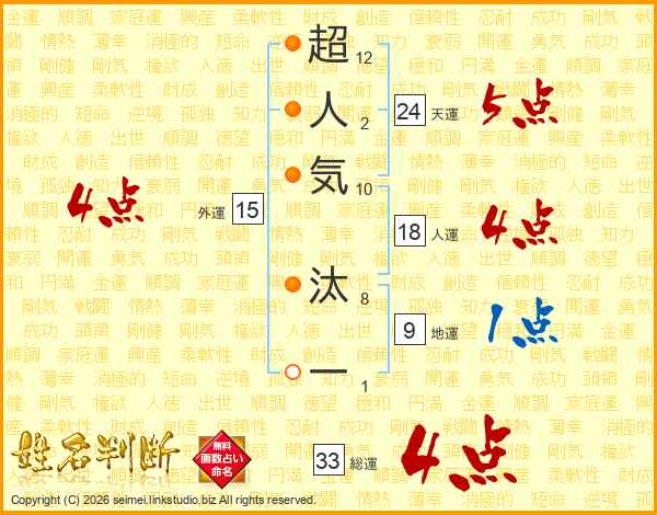 超(12画)人(2画)気(10画) 汰(8画)一(1画)