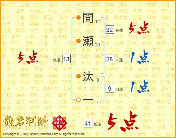 間(12画)瀬(20画) 汰(8画)一(1画)