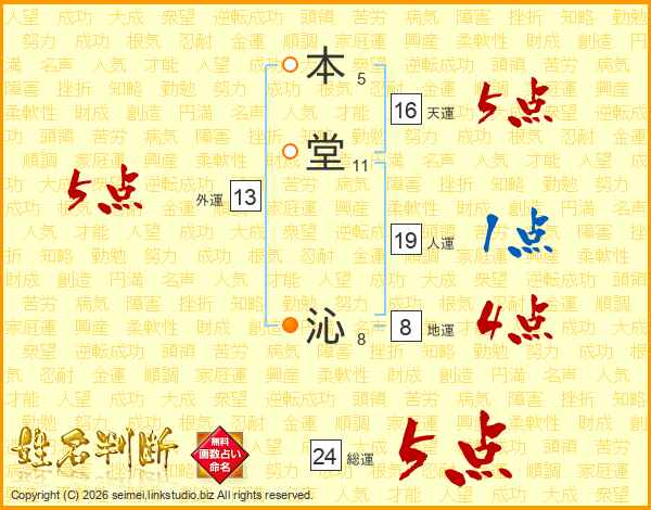 生活面を象徴する運勢です。外部から受ける影響力を表し、結婚運、家庭運や職場、環境への順応性を表します。総運から人運を引いた画数。姓や名が1文字の場合を除く。