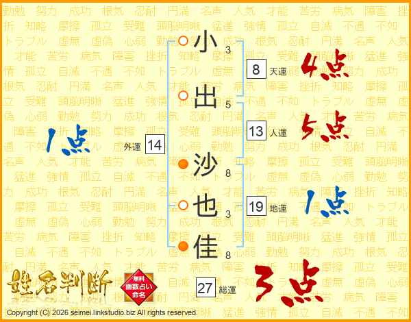 小(3画)出(5画) 沙(8画)也(3画)佳(8画)