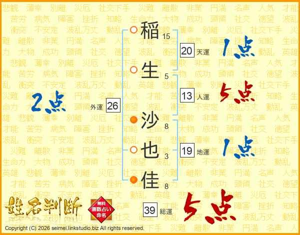 稲(15画)生(5画) 沙(8画)也(3画)佳(8画)