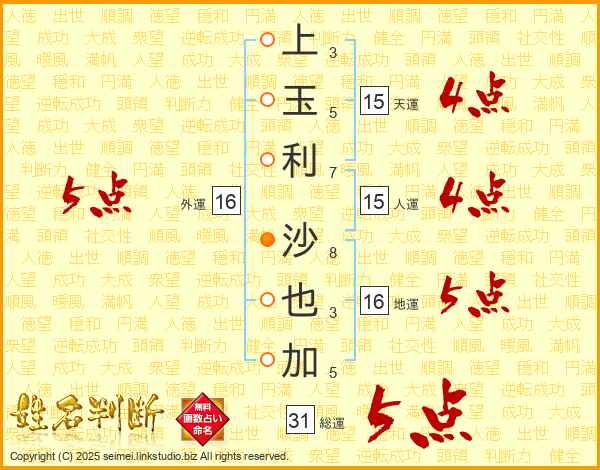上玉利沙也加さんの総運は31画の5点!