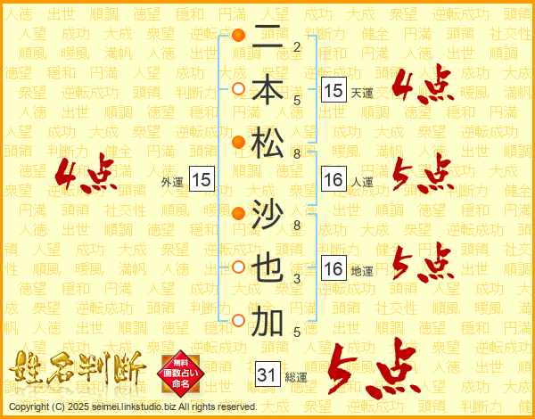 生活面を象徴する運勢です。外部から受ける影響力を表し、結婚運、家庭運や職場、環境への順応性を表します。総運から人運を引いた画数。姓や名が1文字の場合を除く。