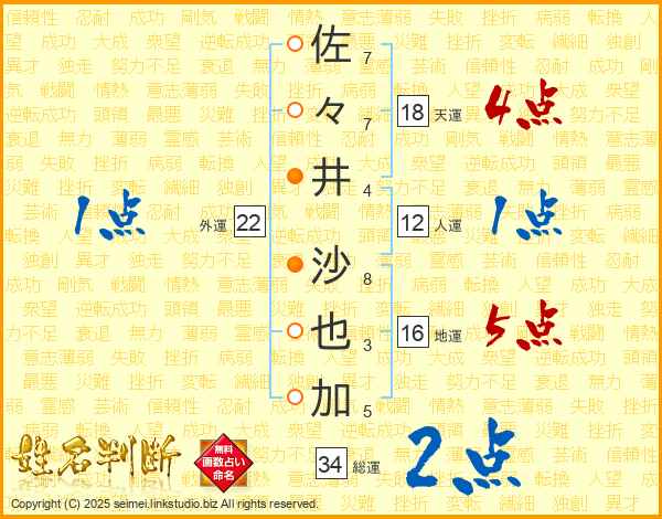 佐(7画)々(7画)井(4画) 沙(8画)也(3画)加(5画)
