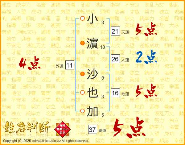 小(3画)濵(18画) 沙(8画)也(3画)加(5画)