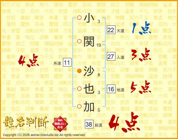 小(3画)関(19画) 沙(8画)也(3画)加(5画)