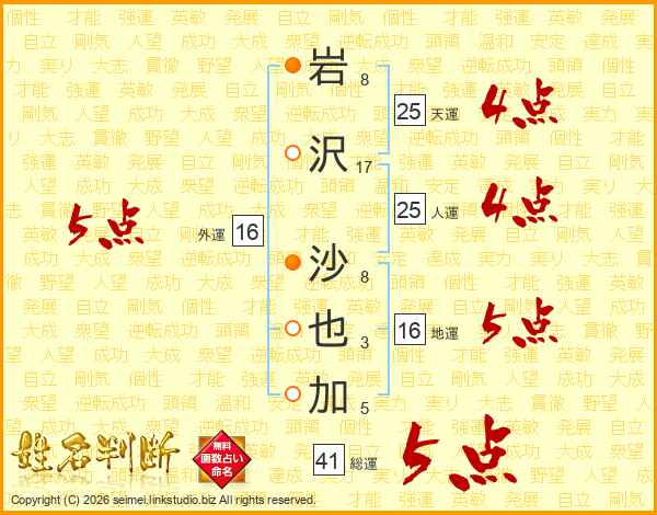 岩(8画)沢(17画) 沙(8画)也(3画)加(5画)