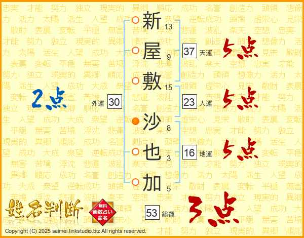 新(13画)屋(9画)敷(15画) 沙(8画)也(3画)加(5画)