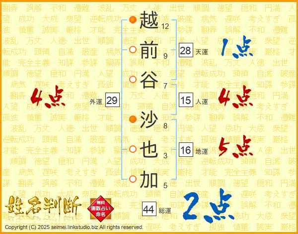 越(12画)前(9画)谷(7画) 沙(8画)也(3画)加(5画)