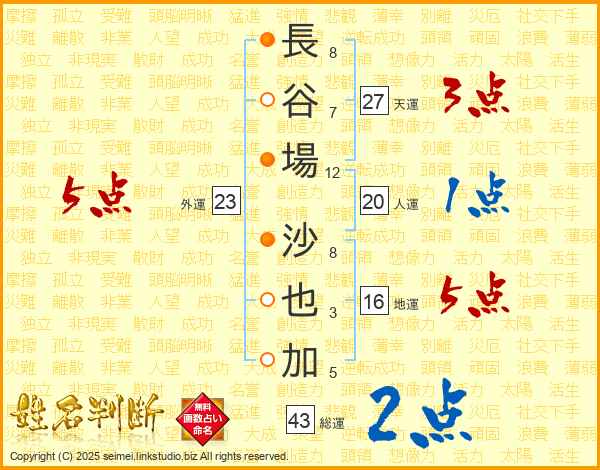 長(8画)谷(7画)場(12画)  沙(8画)也(3画)加(5画)
