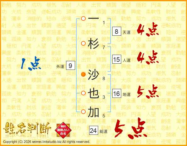 一(1画)杉(7画) 沙(8画)也(3画)加(5画)