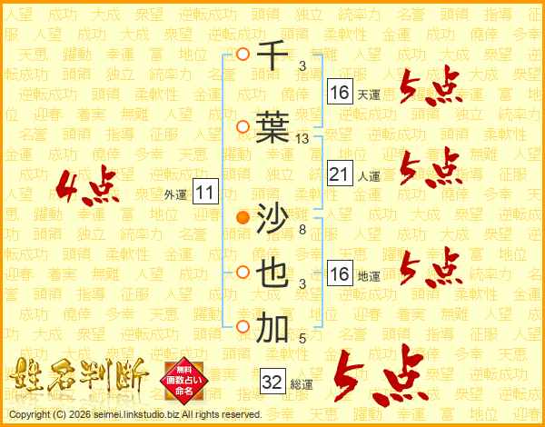 千葉沙也加さんの総運は32画の5点!