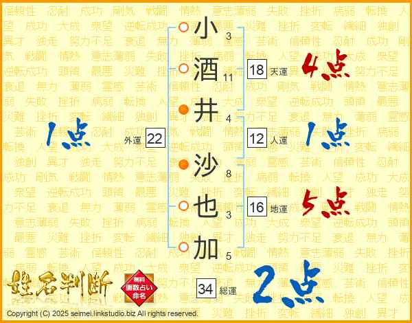 小(3画)酒(11画)井(4画) 沙(8画)也(3画)加(5画)