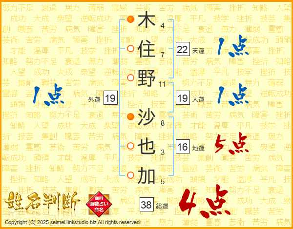 木(4画)住(7画)野(11画) 沙(8画)也(3画)加(5画)