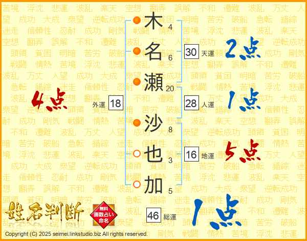 木(4画)名(6画)瀬(20画) 沙(8画)也(3画)加(5画)