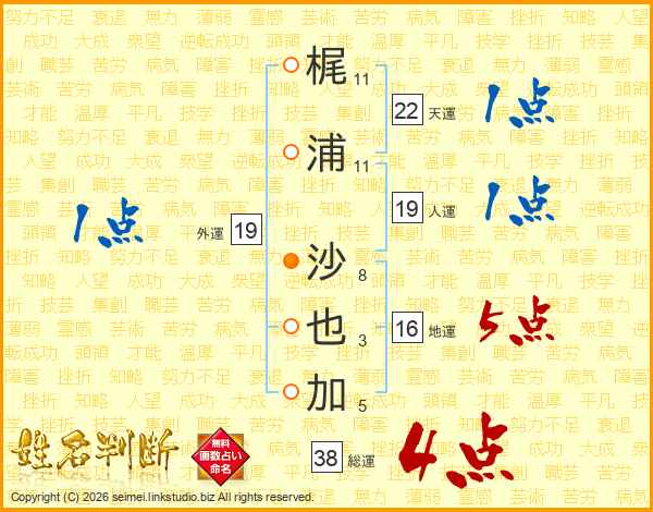 梶(11画)浦(11画) 沙(8画)也(3画)加(5画)
