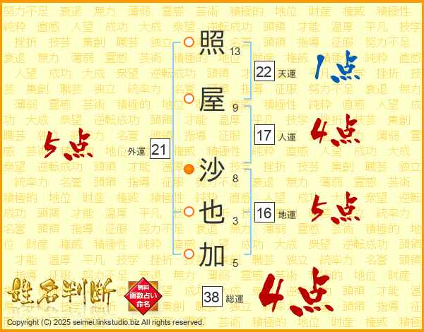 照(13画)屋(9画) 沙(8画)也(3画)加(5画)
