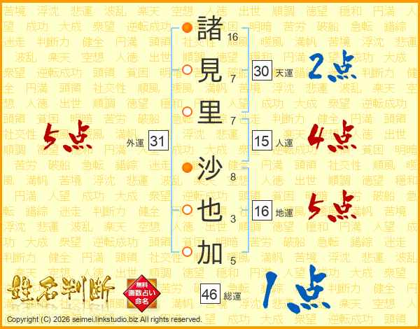 諸(16画)見(7画)里(7画) 沙(8画)也(3画)加(5画)