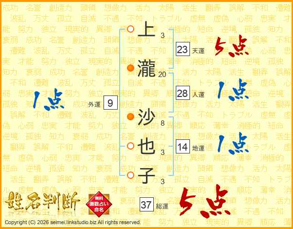 上(3画)瀧(20画) 沙(8画)也(3画)子(3画)