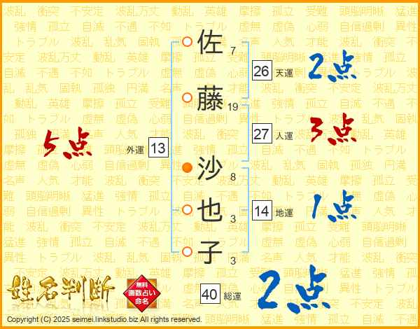 佐(7画)藤(19画) 沙(8画)也(3画)子(3画)