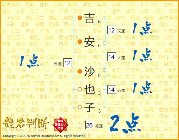 吉(6画)安(6画) 沙(8画)也(3画)子(3画)