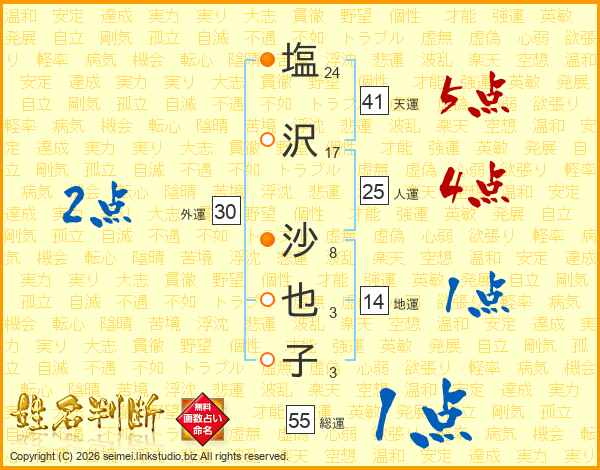 塩(24画)沢(17画) 沙(8画)也(3画)子(3画)