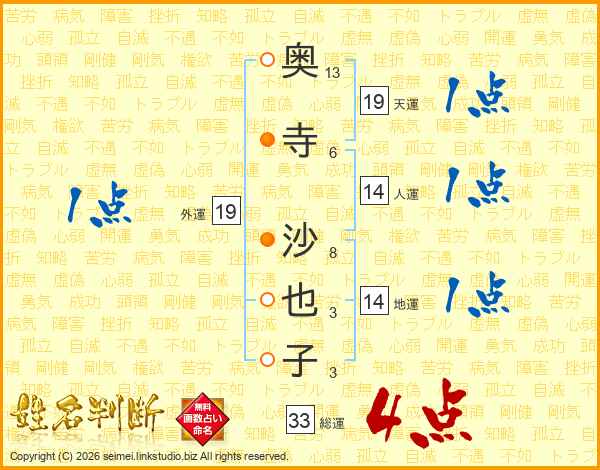 奥寺沙也子さんの総運は33画の4点!