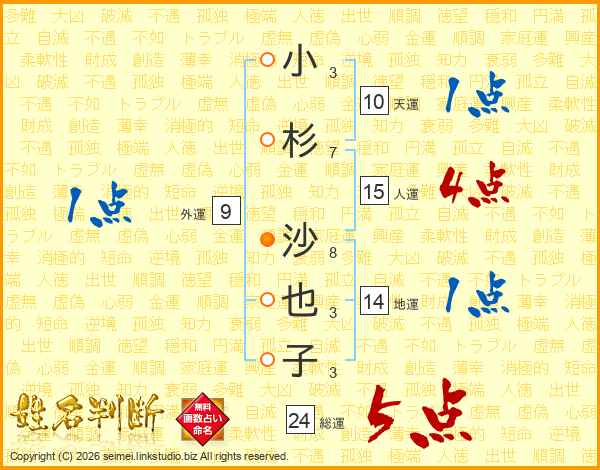 小杉沙也子さんの総運は24画の5点!