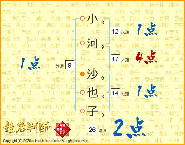 小河沙也子さんの総運は26画の2点!