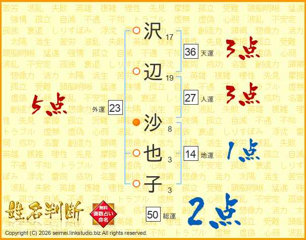 沢(17画)辺(19画) 沙(8画)也(3画)子(3画)