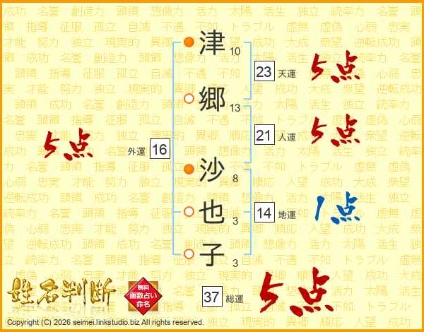 津(10画)郷(13画) 沙(8画)也(3画)子(3画)