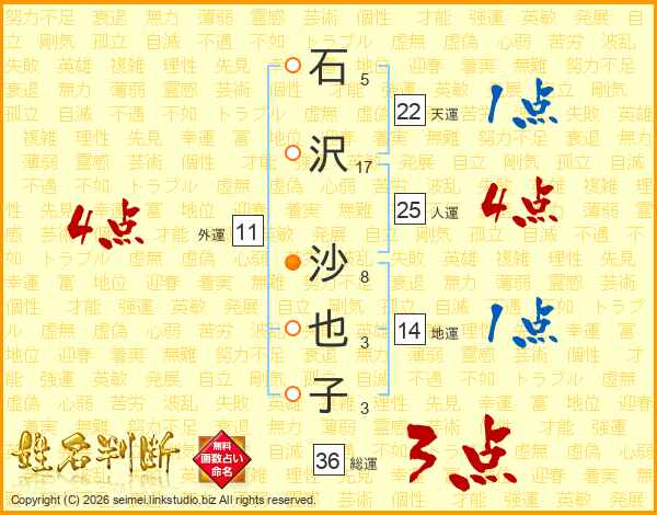 石(5画)沢(17画) 沙(8画)也(3画)子(3画)