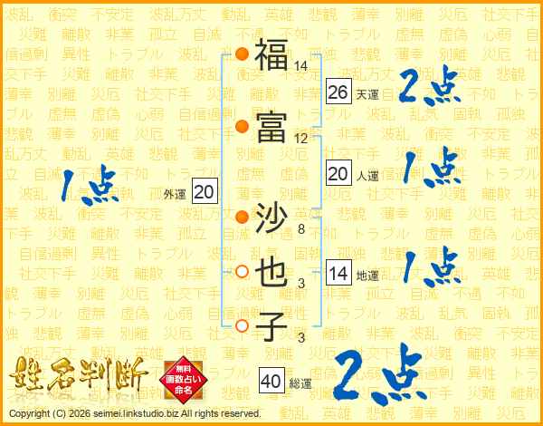 福(14画)富(12画) 沙(8画)也(3画)子(3画)