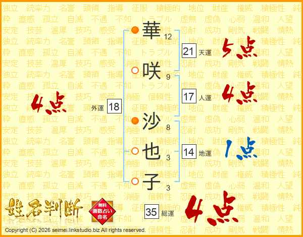 華咲沙也子さんの総運は35画の4点!