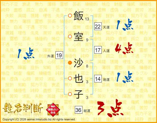 飯室沙也子さんの人運は17画の4点!